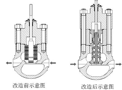 將原閥體切割下來改造好以后反向焊接,改變介質(zhì)流向(將低進高出改成高進低出),用串級結構代替原迷宮結構,閥蓋與閥體之間加一段閥體。